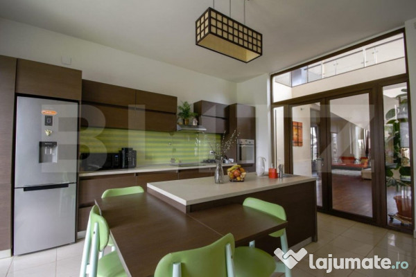 Blitz va ofera spre vanzare casa/villa cu o suprafata utila de 400Mp si o suprafata totala de 850mp. Villa are o arhitectura mediteraniana, compusa din 3 dormitoare spatioase fiecare dotat cu dresing si baie proprie, 2 birouri, un living spatios dotat cu semineu, o bucatarie stil american, cat si 2 camere de depozitare. Facitlitatea suprema este plata facturilor, ele fiind de ordinul unui apartament cu 2 camere datorita panourilor si structurii din sticla a imobilului. Curtea este dotata cu o terasa spatioasa, gratar, lemne, balansuar cat si brazi si pomi ce ofera un aer si o liniste deplina. Villa are 2 locuri de parcare acoperite cat si inca 2 in curte. Pentru mai multe detalii, va rugam sa ne contactati telefonic.