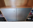 Vitrină Neoset cu polițe din geam securizat.Culoarea nucului.Cu două uși de culoare gri având înăuntru o poliță de lemn. Este calitate Neoset. Lungime 2,15 m Lățime 94 cm Adâncime 32 cm
