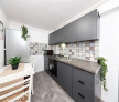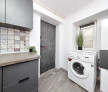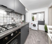 - Bucataria, inchisa, aceasta fiind mobilata si dotata cu plita, cuptor, hota, cuptor cu microunde, frigider, etc.;