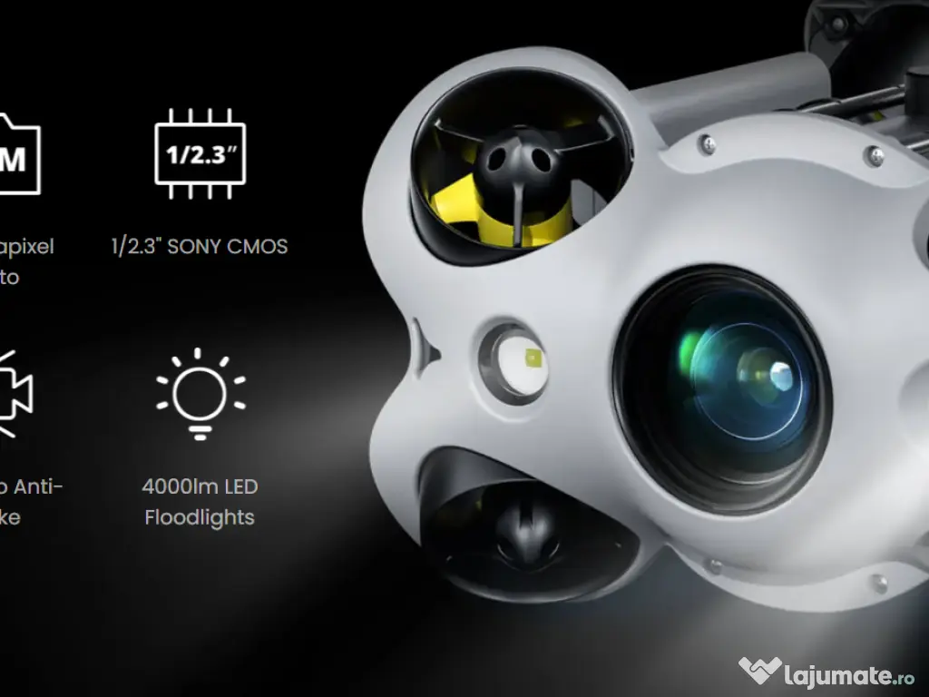 Dronă subacvatică ROV profesională entry-level, ușor de operat și transportat. Ideală pentru inspecții tehnice, verificare structuri, acvacultură, mentenanță și zone greu accesibile.