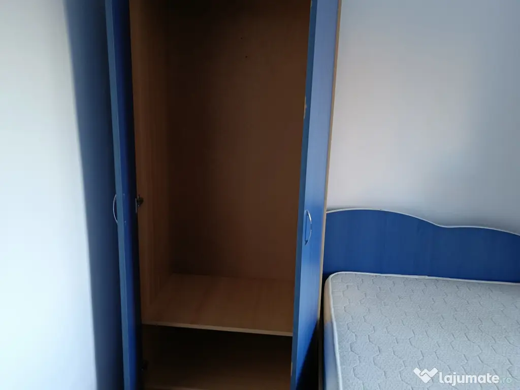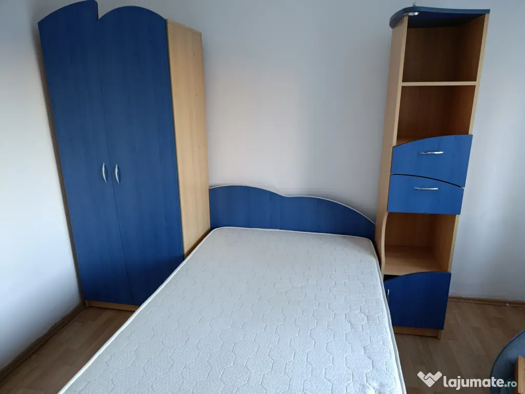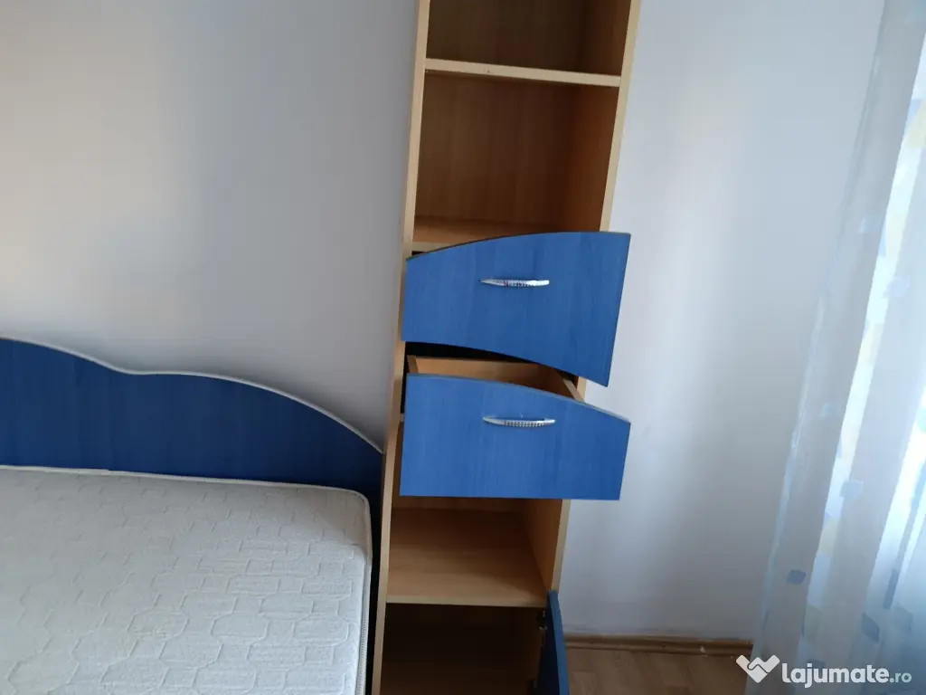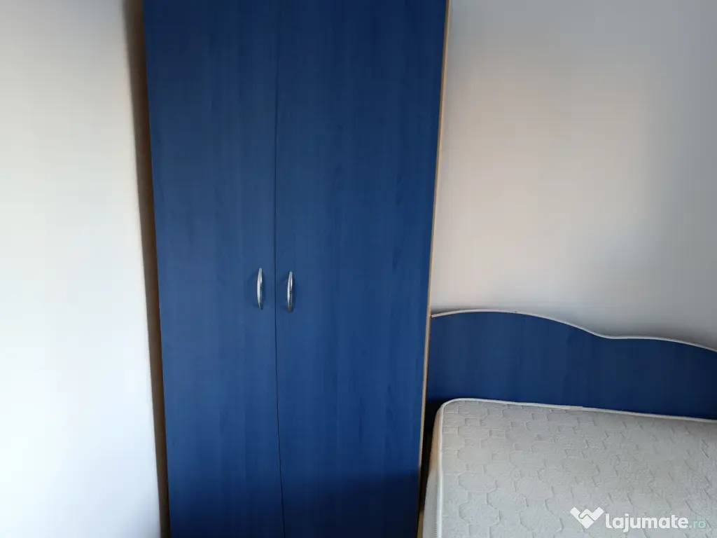 Vând mobila dormitor,pat, saltea Gingin flex, 120/200, foarte puțin utilizată, dulap 2 uși, o poliță și bară umerase, corp soldat, trei polițe, 2 sertare și o ușă, culoare albastru cu crem.