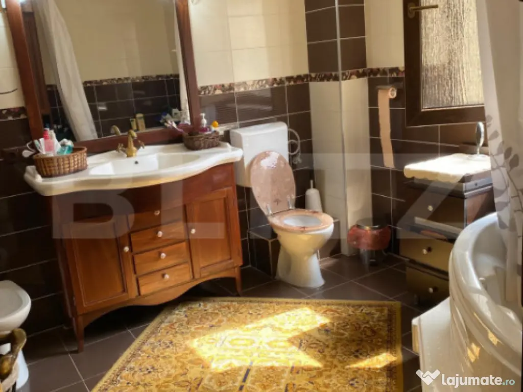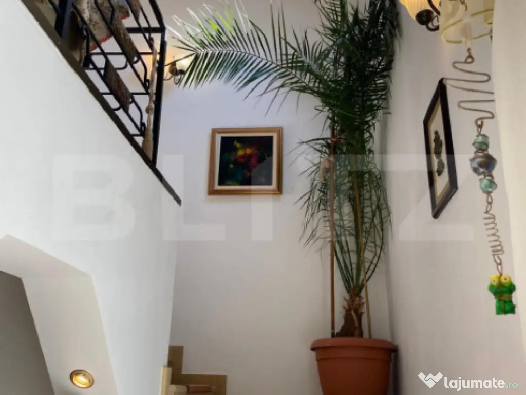 Blitz propune spre vânzare o proprietate deosebită, situată in satul Stejeris, comuna Moldovenesti, la doar 40 km de Cluj-Napoca și 13 km de Turda. Cu o expunere sudică ideală și un teren terasat spectaculos, această casă reprezintă refugiul perfect pentru cei care caută aer curat, intimitate și un stil de viață sustenabil, fără a face compromisuri de la confortul modern. Proprietatea a fost construită în 2001 din BCA, fundație beton, izolație exterioară, finisaje din piatră naturală, cu regim de inaltime P+E+Pod pe un teren cu o suprafata de 1905 mp organizat ingenios pe 4 niveluri terasate. Casa are o suprafață utilă de 196,2 mp si se desfasoara astfel: parterul are o suprafata de 94.9 mp utili si cuprinde - living spațios cu semineu pe lemne, dormitor matrimonial, bucătărie cu iesire pe terasa exterioara si zonă de dining, cămară, baie, holuri, cameră tehnică si scara interioara, totul mobilat in stil clasic, cald si elegant. Etajul are o suprafata de 101,3 mp, cuprinde 4 dormitoare (unul cu logie si fereastra panoramica, unul cu terasă exterioara si vedere a intregii proprietati, doua dormitoare cu ferestre Velux si incalzire dubla, centrala plus semineu si acces la pod, cu trapa), baie și hol generos. Podul are o suprafata de 20 mp, spatiu util si usor accesibil. Proprietatea este dotata cu centrala pe gaz cu termostat inteligent, centrala pe lemne, 1 boiler electric si 1 boiler termic. Toata tamplaria este golden oak, import Germania cu geam termopan, acoperis tigla metalica, tavane dublate cu rigips, iluminat cu spoturi. Utilitati: Apă, racordare la rețeaua publică + Fântână proprie cu hidrofor și stație de dedurizare (ideală pentru casă și irigații); curent electric; Fosă septică (aprox. 10 mc); Sistem de alarmă și supraveghere video si senzori crepusculari; Internet prin fibră optică. Terenul este organizat pe 4 nivele. Nivel 1 (Curtea pavata cu dale de beton): Atelier (39 mp) cu mansarda constructie noua, din beton, caramida, acoperita cu tigla metalica pentru depozitare și orice fel de alte activitati. Nivel 2 (Relaxare): Zonă pentru piscină/plajă, grătar și un Foișor închis octogonal (bucătărie de vară complet mobilata modern si elegant , echipată cu plită pe gaz, cuptor electric, frigider), conectata la utilitati. Nivel 3 (Producție): Grădină de zarzavaturi (50 mp), livadă cu 28 pomi fructiferi (cireși, piersici, meri, nuci), zmeură, strugurei, agrise și mure. Boxe pentru unelte/păsări (5 mp) cu țarc împrejmuit, 15 mp. Nivel 4: Livadă exterioară cu peste 50 de pomi fructiferi (pruni, nuci, aluni). Proprietatea este imprejmuita cu gard din beton placat cu piatră de Vistea, lemn și plasă sudată. Porți automate, curte placată cu dale și spații verzi amenajate. Această proprietate nu este doar o casă, ci un mod de viață! Nu pierdeti ocazia de a vizita si, eventual, de a achizitiona aceasta casa splendida un spatiu unde confortul, eleganta, functionalitatea si natura se intalnesc armonios! Cod ofertă / ID BLITZ: P169153 Id intern: P169153 Număr niveluri imobil: 1 Număr Băi: 2 Curent Apă Gaz